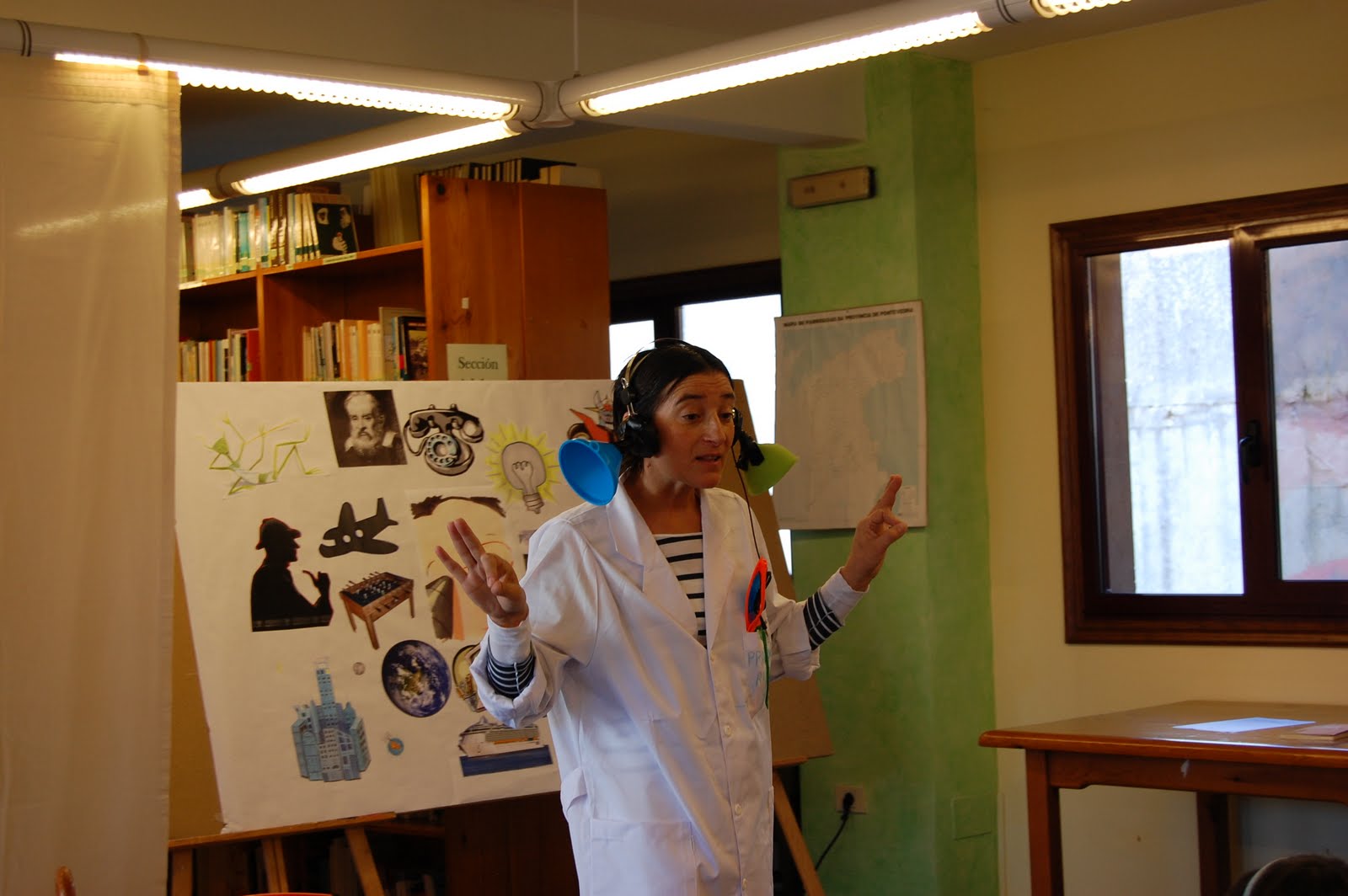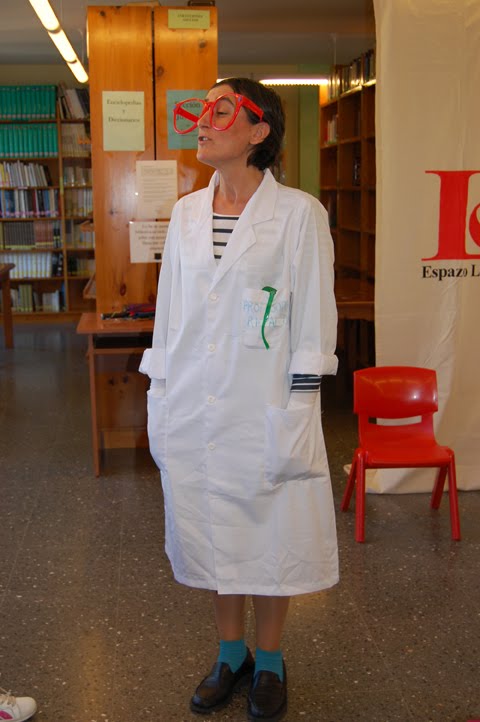 Despois chegou o momento de coñecer a convidada desta sesión, pero un presentador algo toleiras anunciou que María Alcañiz non podía acompañarnos e que mandara no seu lugar á mesmísima profesora Ripaldi. O problema é que en vez dunha profesora apareceron tres, que só se diferenciaban pola cor dos seus lentes. Logo de escoitar a historia de cada unha delas, os nenos votaron levantando unha cartolina coa cor dos lentes da que menos mentiras contara sobre a súa vida e que, polo tanto, era a verdadeira profesora Ripaldi.